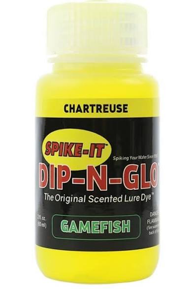 Dip-N-Glo is specially designed for dipping soft plastic lures to instantly dye and produce permanent color changes. Our scented varieties provide a powerful scent that is the longest lasting available. Dip-N-Glo has given anglers the upper hand on their competitors for more than 25 years. Don’t go fishing without it! NOTE: Not for use on stretchy plastics.